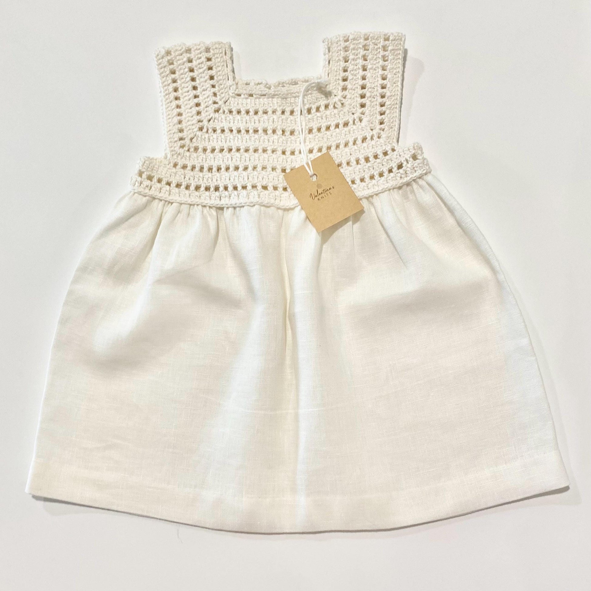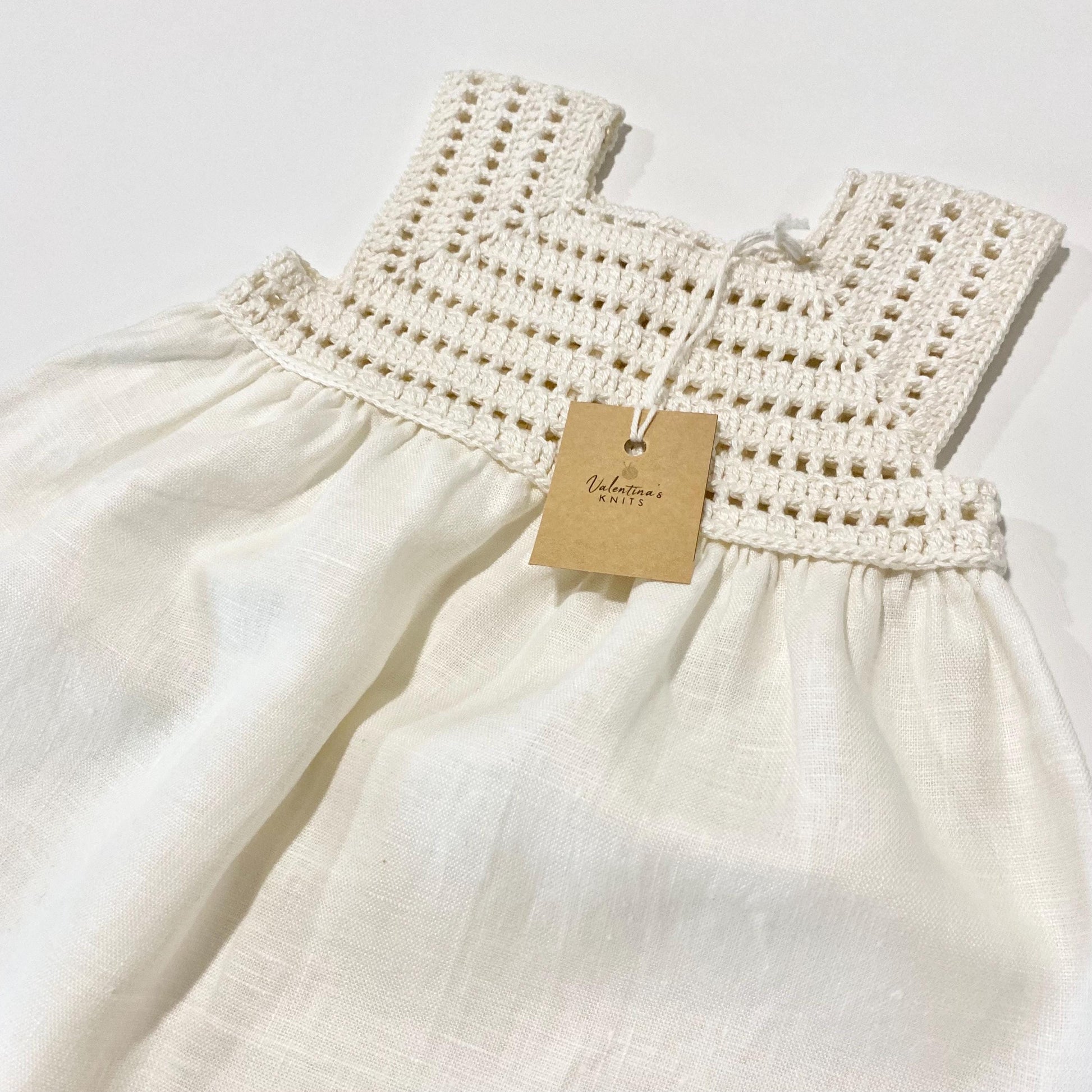 This baby dress is made of 100% cotton handmade crochet yoke with 100% linen bottom.